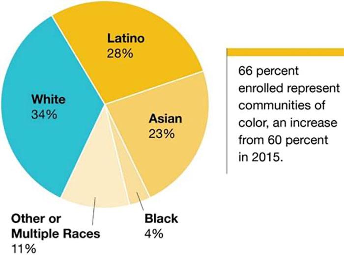 Over the past six years, Covered California has seen a steady increase in the diversity of its new consumers who sign up during special and open enrollment. The data shows that nearly two-thirds (66 percent) are from communities of color, which represents an increase from 60 percent in 2015 (see Figure 3. Special and Open-Enrollment Plan Selections by Ethnicity).