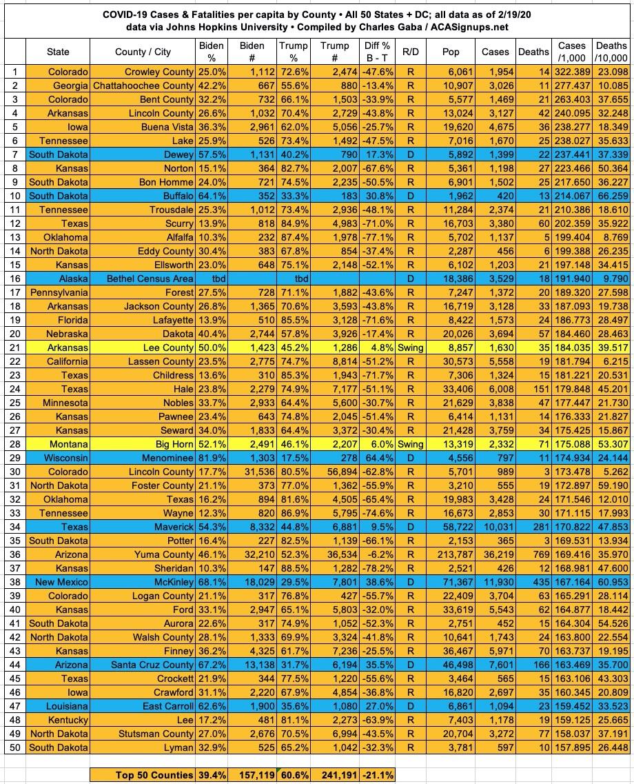 As of today, both cumulative COVID-19 Cases and Deaths per capita are running higher in the Red Counties: