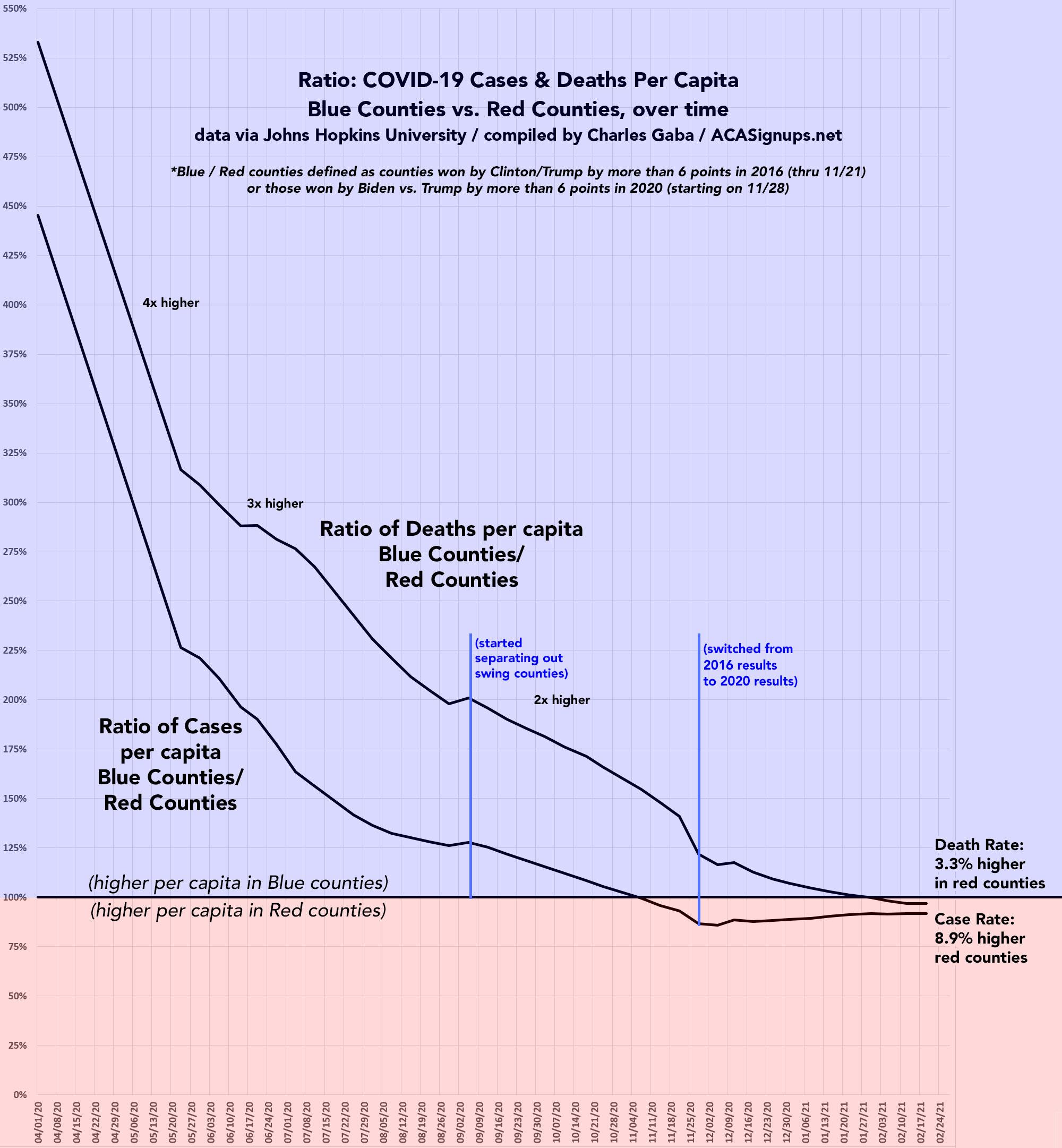 It's also worth noting how the ratio of per capita cases and mortality have shifted between the Blue and Red-leaning counties over time.