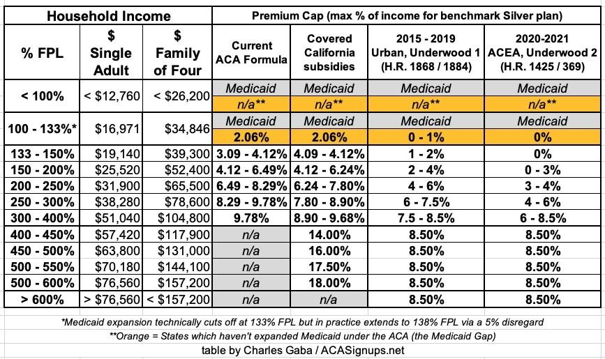 Here's a final table which includes all four formulas. I've also added rows to distinguish between states which have expanded Medicaid under the ACA and those which haven't, which makes a big difference for those in the 100 - 138% FPL income range:
