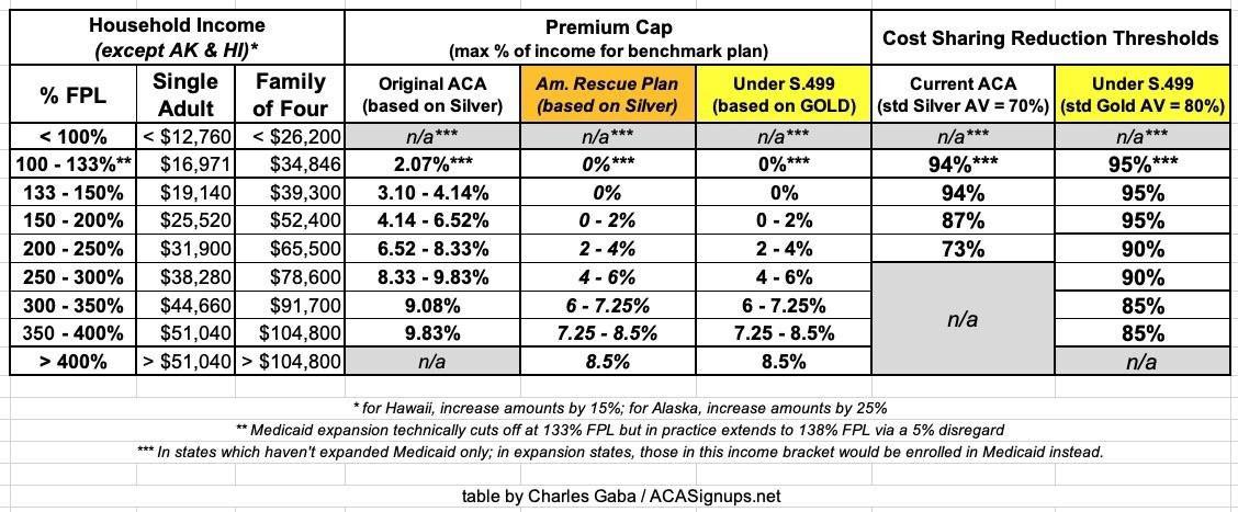 Here's a table summarizing how S.499 would change both the APTC and CSR subsidy formulas compared to the official ACA and the American Rescue Plan (which is currently only in place for 2 years):
