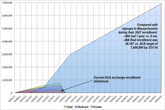 Update: Just to keep things in perspective (and reality-based), I've pulled out to the 7 million target figure and superimposed the Massachusetts "RomneyCare" signup chart from 2007 over it to give an idea of how that comparison is going. Bear in mind that they had a full year to signup vs. 6 months, so I've squished the timeframe in half to match the ACA target of 7 million by 3/31/14: