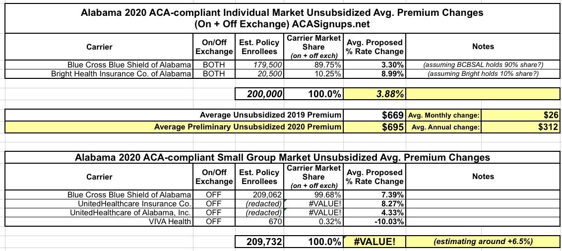 Alabama only has two carriers offering Individual Market policies. Unfortunately, the rate filing forms are redacted in some states, so I'm having to patch together bits & pieces of data to try and estimate the weighted average rate changes. In the case of Alabama, the filing for Blue Cross Blue Shield lists 179,500 total individual market enrollees in 2018, but there's no data for 2019...while the filing for Bright Health Insurance (a relative newcomer to the market) doesn't list any enrollment data at all.