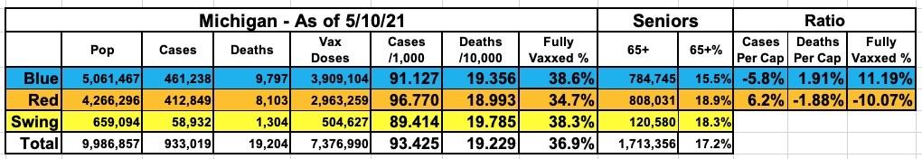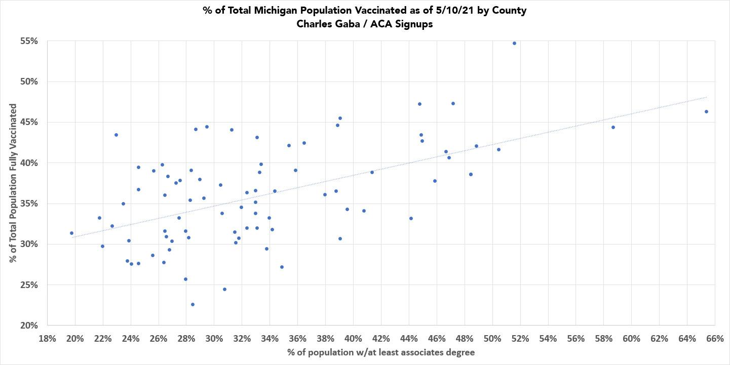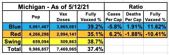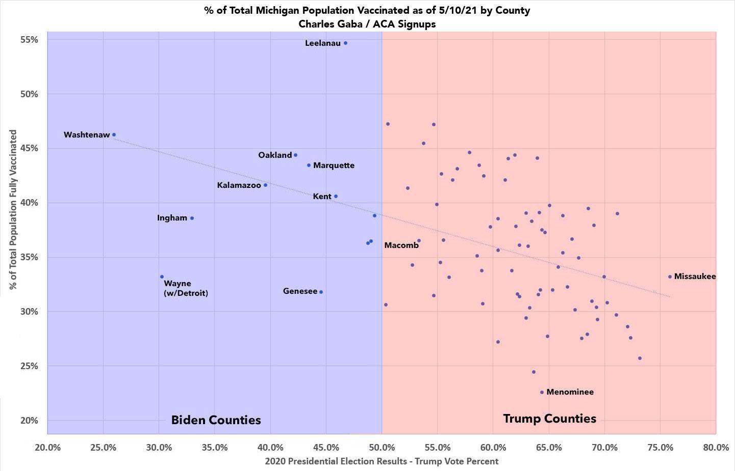 ...On the vaccine front, meanwhile...yep, as of today, Michigan's handful of large Blue counties (the 12 counties which voted for Biden last fall have 55% of the population) have vaccinated 36.2% of their residents, while the other 71 Trump-voting counties have only vaccinated 32.9% of theirs.