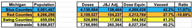 ...On the vaccine front, meanwhile...yep, as of today, Michigan's handful of large Blue counties (the 12 counties which voted for Biden last fall have 55% of the population) have vaccinated 36.2% of their residents, while the other 71 Trump-voting counties have only vaccinated 32.9% of theirs.