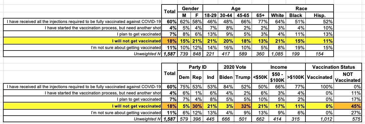 The good news is that the other 55% of those ~87 million adults are gettable: Again, 11% say they've gotten their first shot, so it's just a matter of making sure they follow up with the 2nd one; 17% say they plan to do so (get a move on, folks! the Delta variant is upon us!), and 27%...or perhaps 23.5 million...are "gettable" with the right message, assistance, etc.