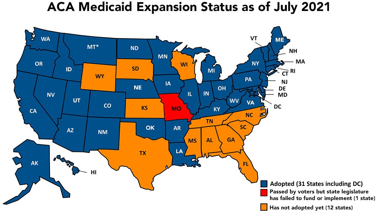 Here's what that looks like nationally (this map was originally created by the Kaiser Family Foundation (KFF); I've updated it to reflect the states which have expanded Medicaid more recently):