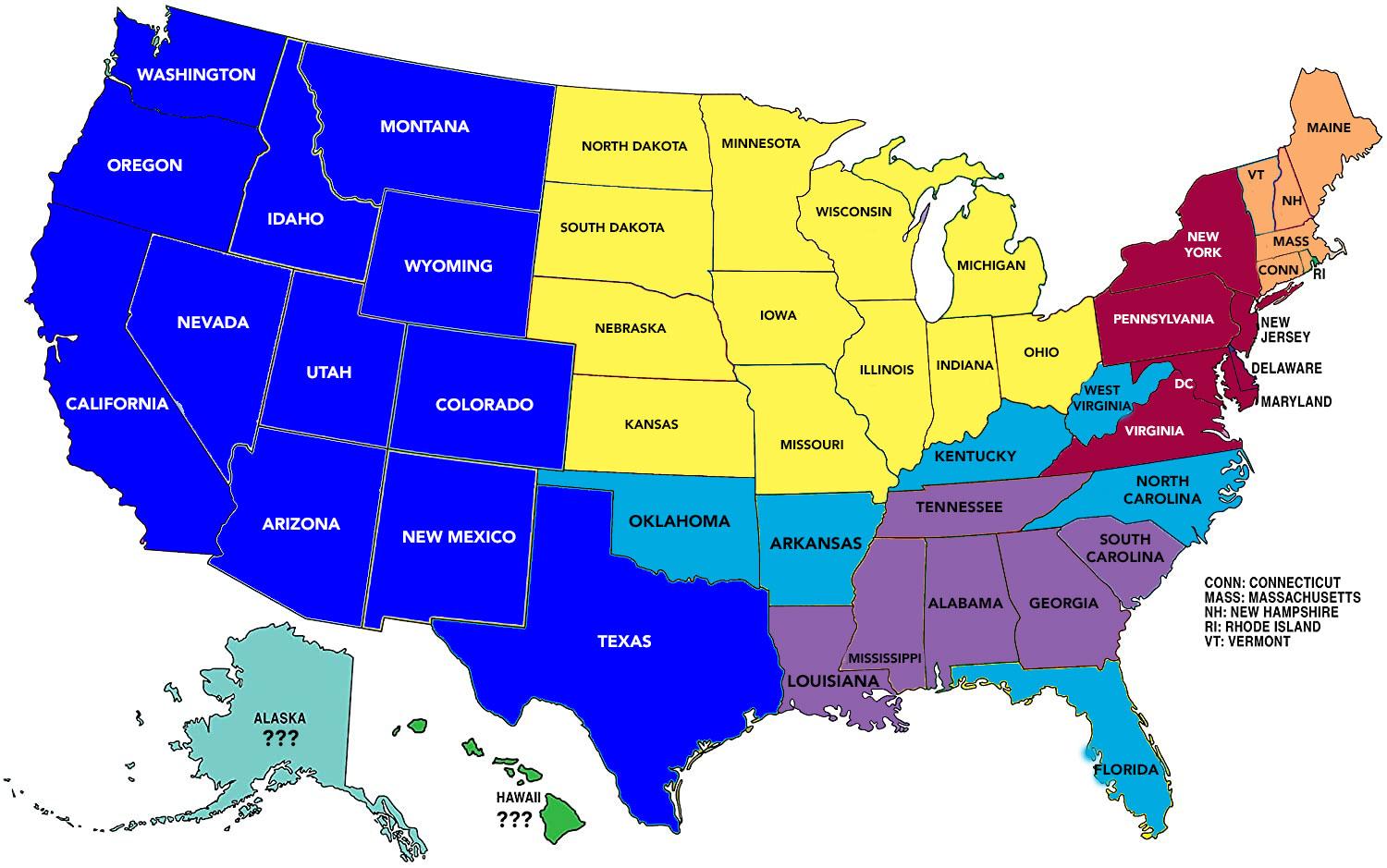 Obviously, your opinion my vary on some of these, but overall I think it's pretty good. Here's a crude map of how I have the country broken out. Note that I didn't know what the heck to do with Alaska and Hawaii, and I seriously debated about whether to split the Dakotas, Nebraska and Kansas out on their own before deciding to keep them lumped in with the rest of the Midwest:
