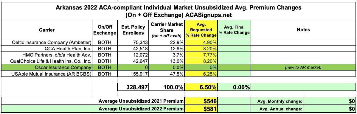Arkansas: Preliminary avg. 2022 #ACA premium rate changes: +6.5% indy market; +4.1% sm. group