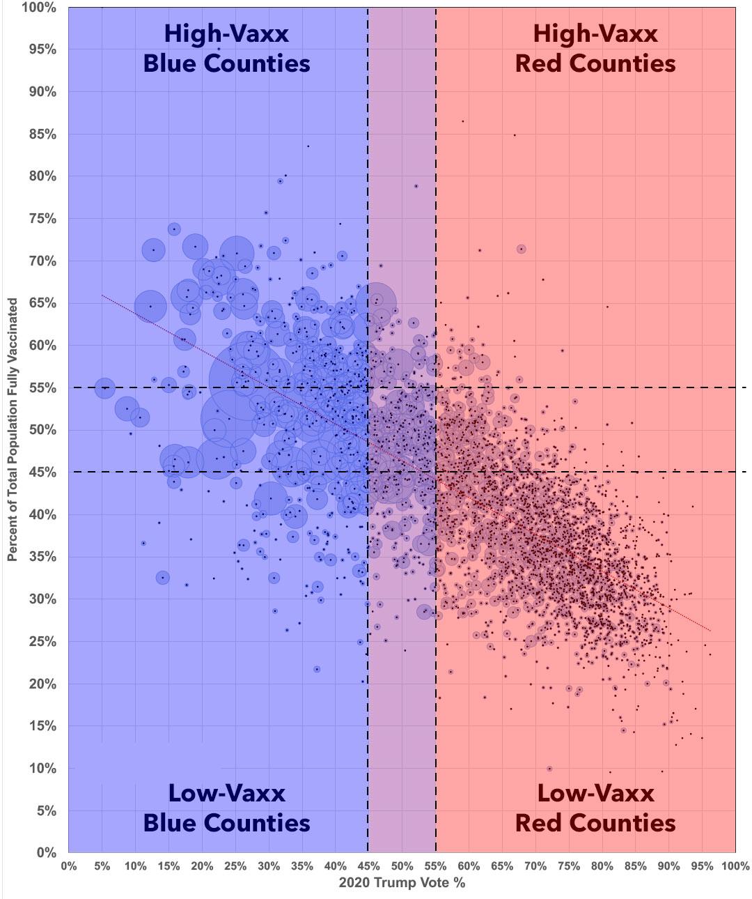 At the time I was mostly interested in looking at the outlier counties--the poorly-vaccinated solidly blue counties and the highly-vaccinated solid red counties.