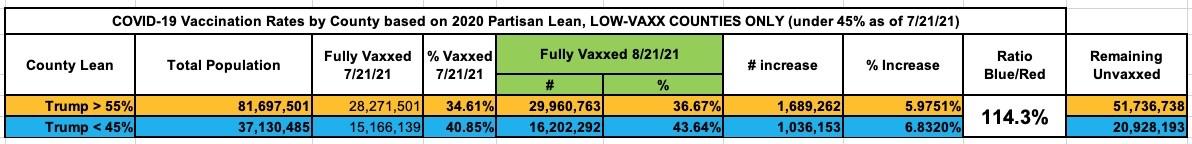 From July 21st (the very day that the GOP/FOX messaging "reversal" began) through August 21st (exactly one month later), the number of fully vaccinated Blue Low-Vaxx county residents has increased by 1.04 million, while this number has increased by 1.69 million in the Red Low-Vaxx counties...63% higher in terms of raw numbers.