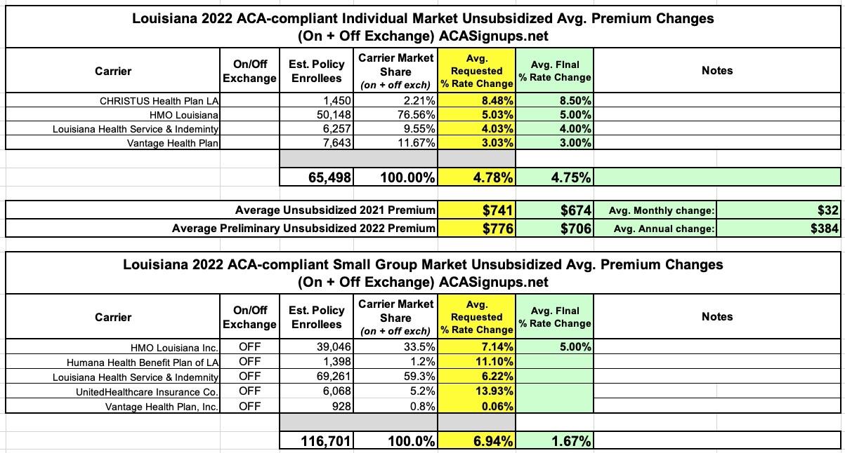 Louisiana: 2022 ACA premiums: +4.8% indy, +6.9% sm. group