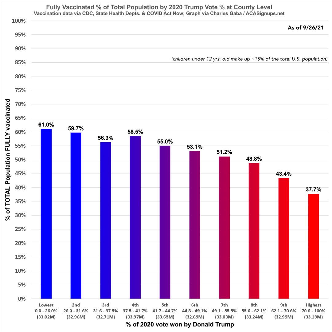 - Breaking the vaccination and case/death rates into even 10% brackets (0-10%, 10-20%, etc.) is a problem because the U.S. population isn't evenly spread from 0 - 100%. Over 84 million Americans live in counties which gave Trump between 40-50% of the vote in 2020, while only 1.7 million live in counties where he received 0 - 10% of the vote...and only 118,000 live in the 90 - 100% bracket.