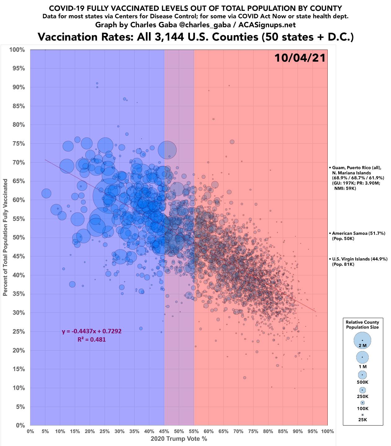 - Most importantly: These graphs only lay out where the higher/lower vaccination, case and death rates are, not necessarily WHO. Remember, the reddest counties still usually have blue patches and vice-versa.