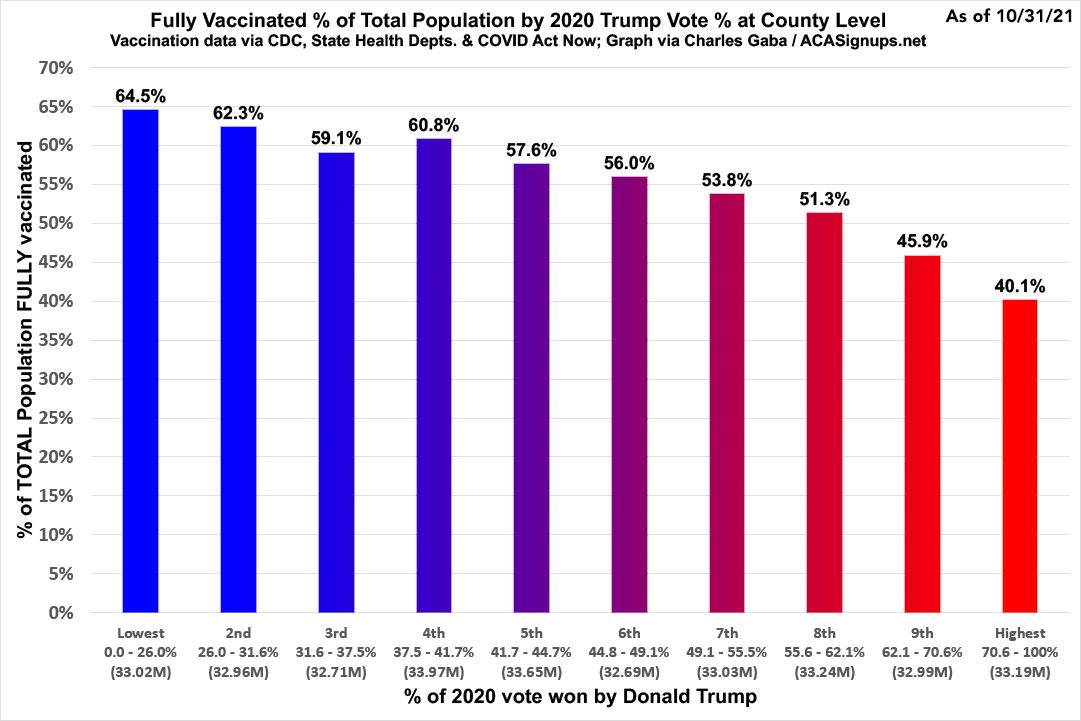 Ironically, prior to the COVID pandemic, ultra-liberal Marin County (Trump only received 16% of the vote here) happened to be one of the birthplaces of the recent "anti-vaxx movement" resurgence, while deep red Sumter County (Trump received 68% of the vote) happens to be home to "The Villages", the massive retirement community where Trump held rallies last summer.