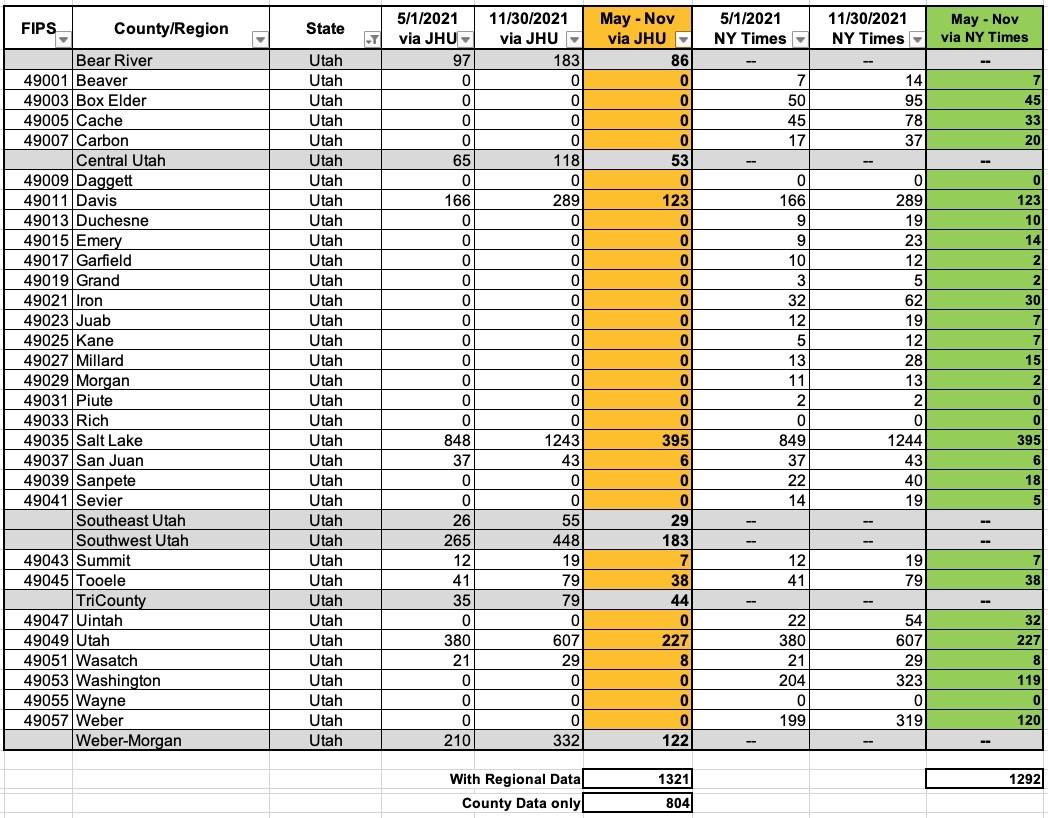 Now, on the whole, the Utah issue isn't nearly as big as the mistake they made with Florida; instead of being 15x higher than NPR's database had it at, Utah's actual county total is only around 60% higher. Utah is also a much smaller state population-wise, and it didn't experience the massive fall Delta variant surge that Florida did either, so it's a far less egregious error. Finally, the JHU and NY Times numbers do match for 10 of the 29 counties (in 3 cases it's because they apparently really haven't had a single reported COVID death to date!)