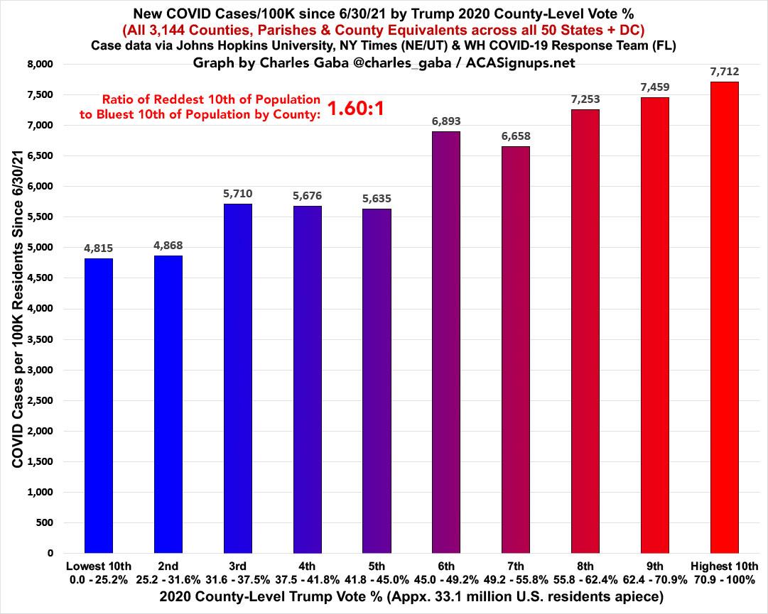 Here's the weekly look at the rate of COVID-19 cases & deaths at the county level since the end of June, broken out by partisan lean (i.e, what percent of the vote Donald Trump received in 2020).