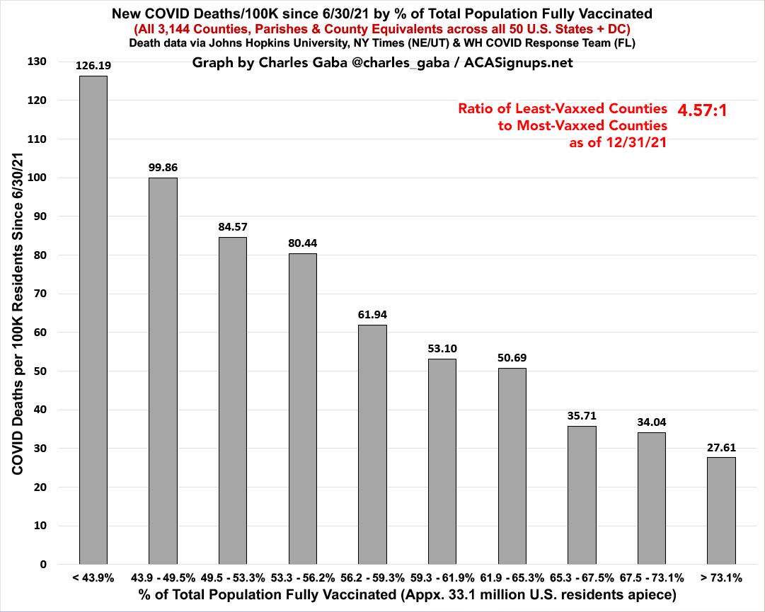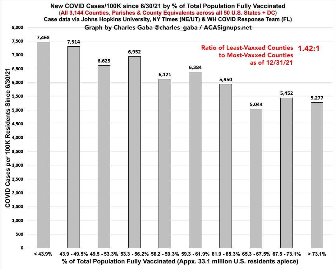 Note: As I explained in a recent blog post, Miami-Dade County, officially part of the "most-vaccinated bracket," is a massive outlier when it comes to the relationship of cases/deaths to the official vaccination rate, and I strongly suspect this is due to a substantially high incidence of "vaccine tourism" combined with the "snowbird" effect. It therefore likely belongs in the 7th or 8th brackets instead & both the case & death rates in the 10th bracket are likely a bit lower still than the official data would indicate.
