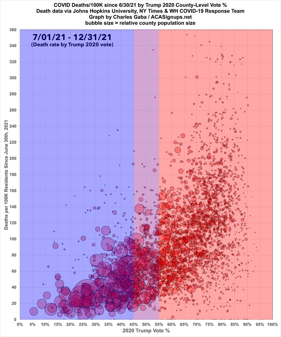 The partisan ratio of case rates are now only running 1.6x higher per capita in the reddest tenth of the country than the bluest tenth, down from 3.0x higher in late October, 2.4x higher two weeks ago and 2.0x higher just a week ago, reflecting how contagious the Omicron variant is in terms of infecting people even if they're fully vaccinated (death rates are clearly a very different story, however, as you'll see below):