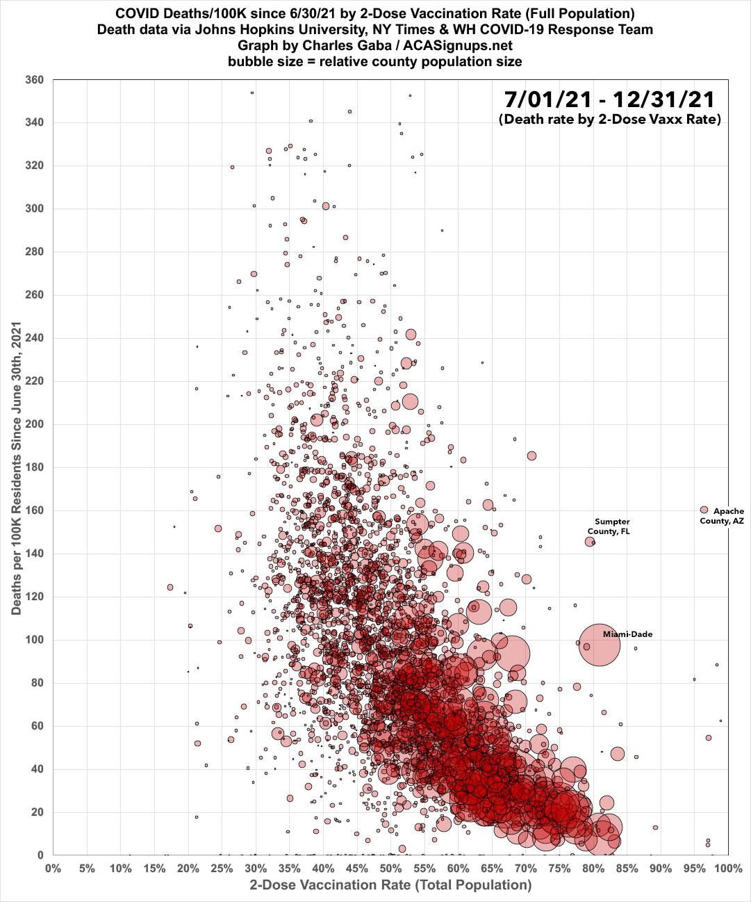 Here's the same death rate data (since June 30th) in scatter-plot format. The massive Miami-Dade County outlier is obvious when displayed this way. I've also labeled Apache County, AZ which is another case of curious vaccination data (thanks to a reader who wishes to remain anonymous for calling this out to me)--the CDC has Apache (which includes a portion of the Navajo Nation) as being a whopping 96% fully vaccinated...but the official Arizona Health Dept. COVID dashboard has it down as only being less than 42% vaccinated.