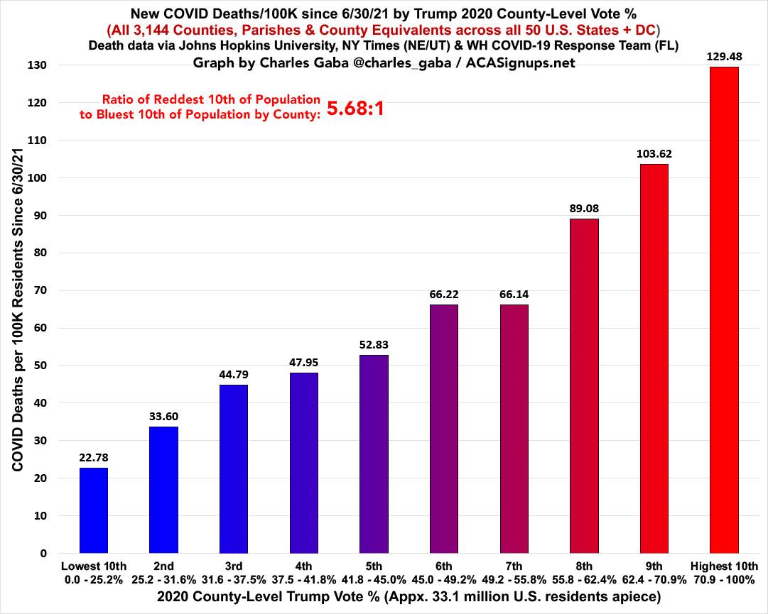 The partisan ratio of death rates since June, however, is still 5.7x higher in the reddest tenth than in the bluest tenth...down from 6.0x higher in late October, but up from 5.6x couple of weeks ago: