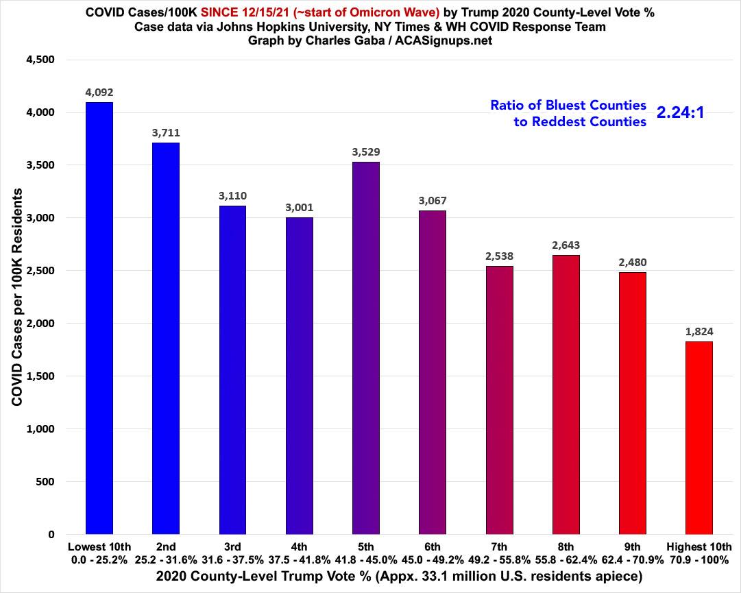 FIRST, here's my final Delta wave graphs, which run from June 15th, 2021 - December 15, 2021. For that period of time, new COVID-19 case rates ran 2.46x higher in the reddest tenth of the U.S. than the bluest tenth...while COVID-19 death rates ran 5.77x higher: