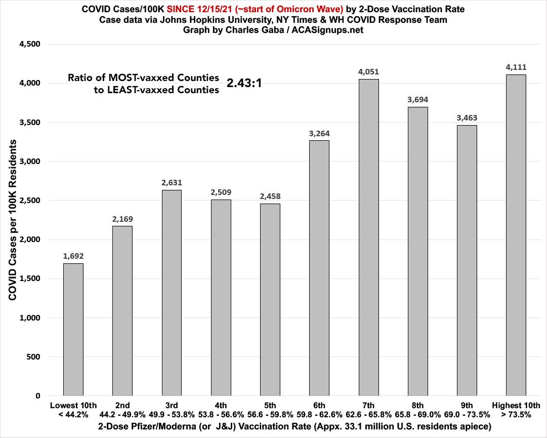 Here's the same data from a NONPARTISAN view: This is based purely on 2-dose vaccination rates (as of 12/15/21). Case rates in the least-vaccinated tenth of the U.S. ran 2.1x higher than in the most-vaccinated tenth, while death rates ran nearly 4.8x higher: