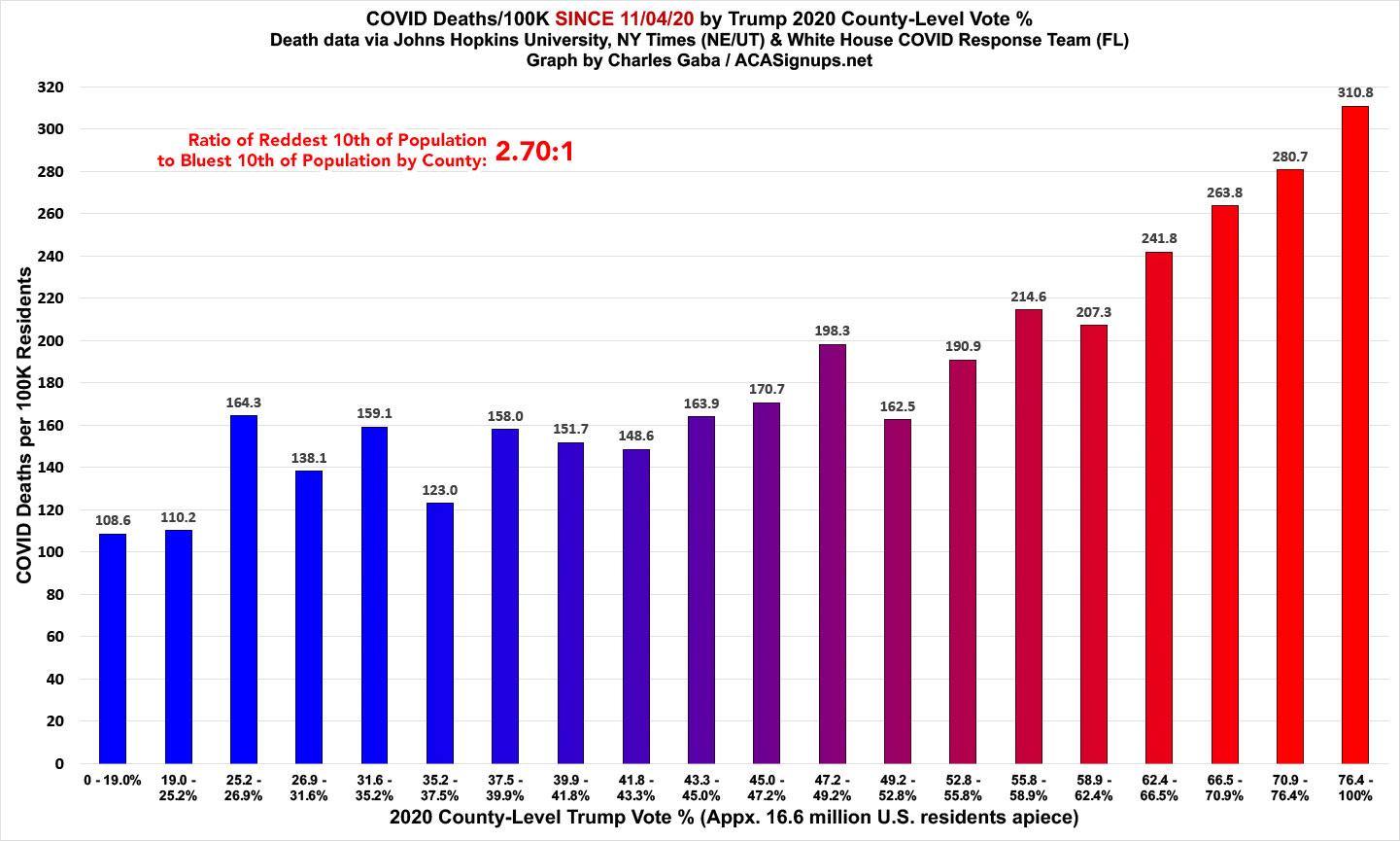 If you start with November 2020, the ratio is even less extreme, since it includes the massive 3rd wave from around October 2020 - March 2021 in which the death rate still leaned slightly higher in the bluer parts of the United States or where it was pretty much evenly spread across the partisan county spectrum. Even so, the death rate from 11/04/20 - today is still 2.7x higher in the reddest decile of the country than the bluest...with a fairly steady trend line in between.