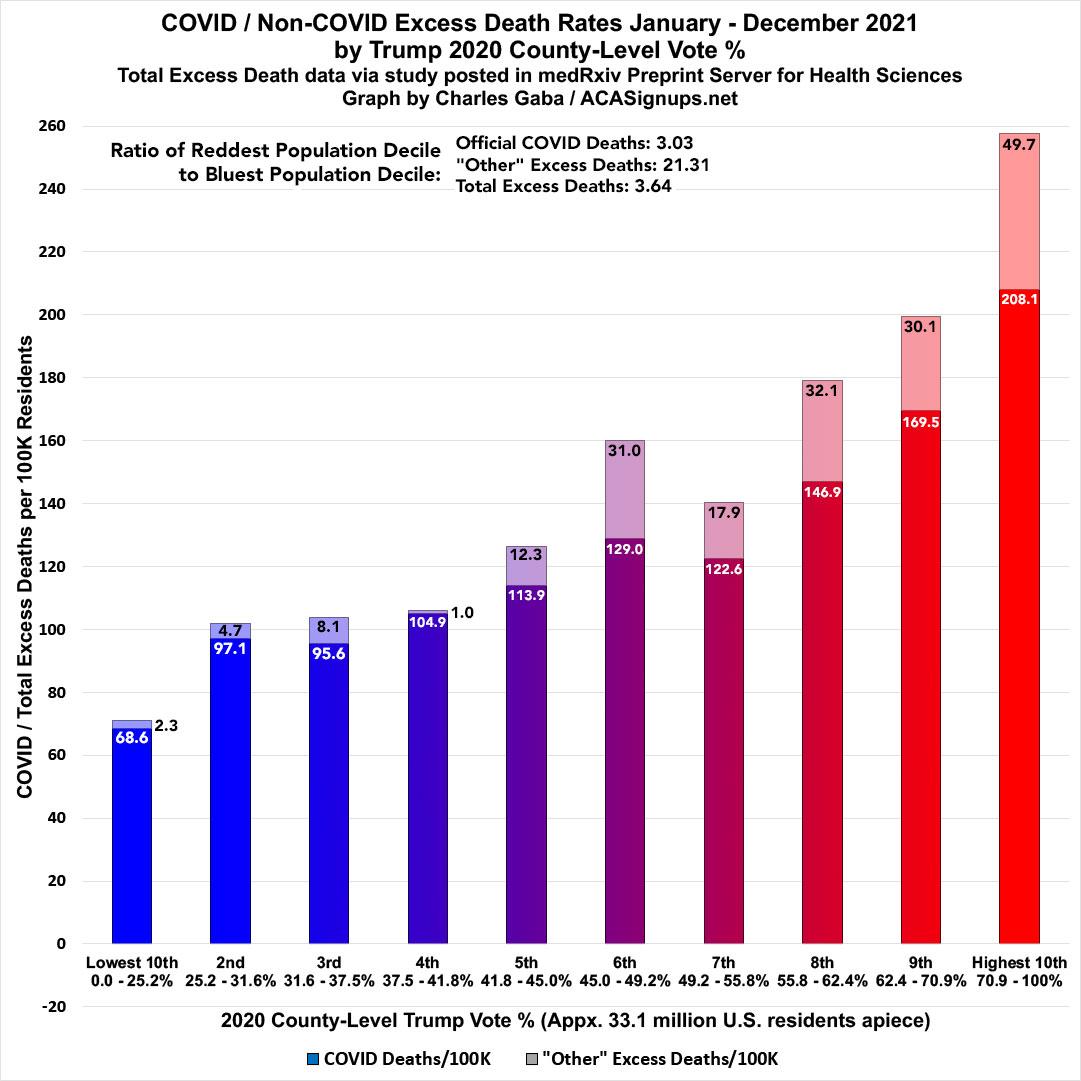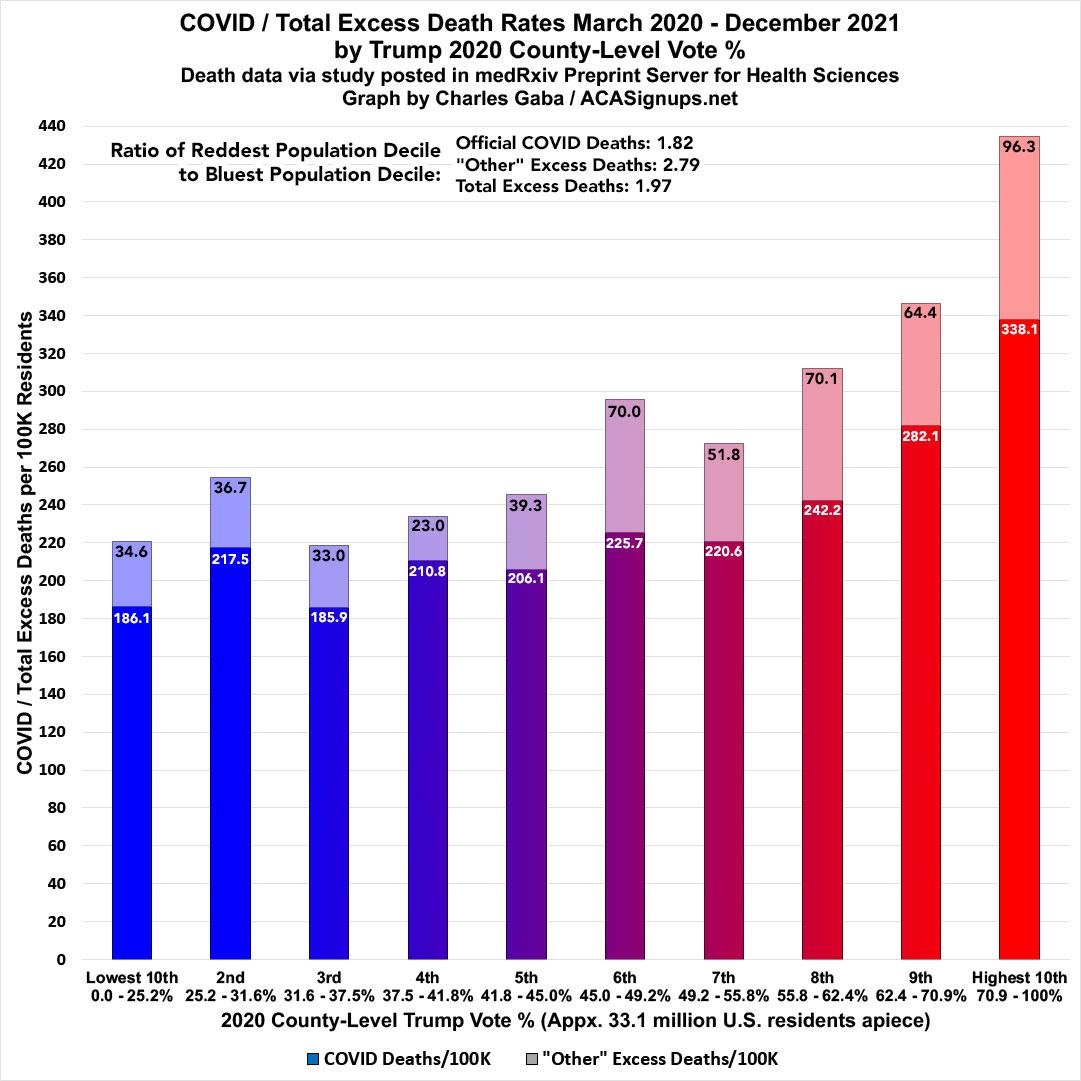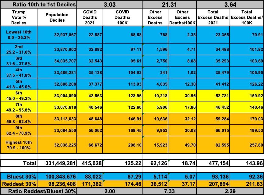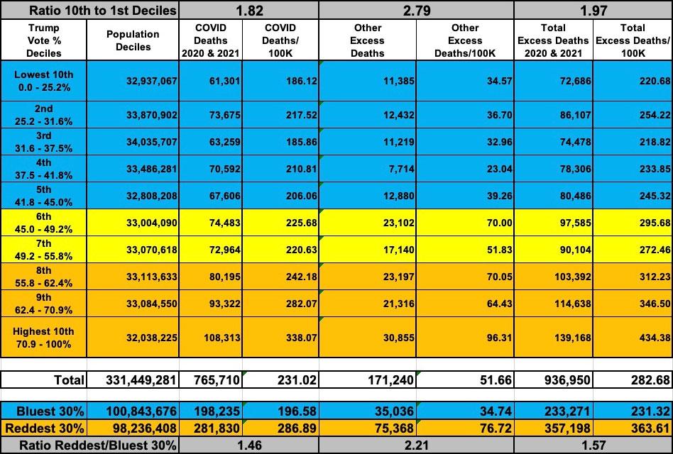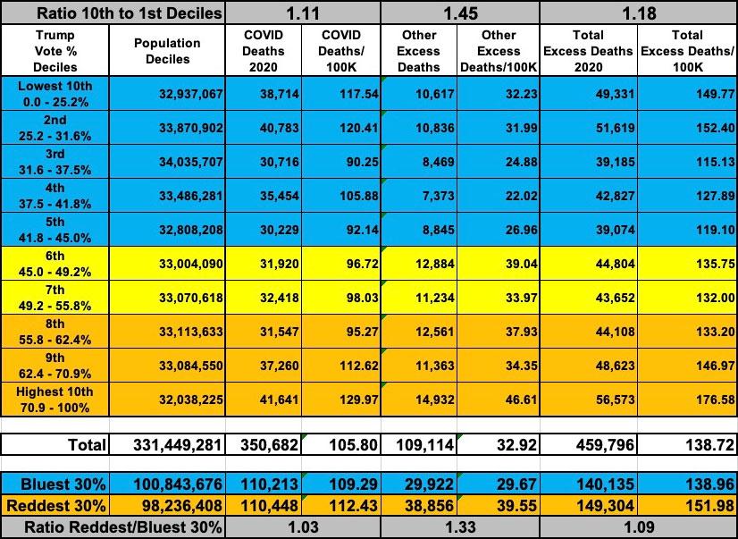 Combined with the official COVID deaths, the excess death rate was over 3.6x higher in the reddest decile than the bluest.