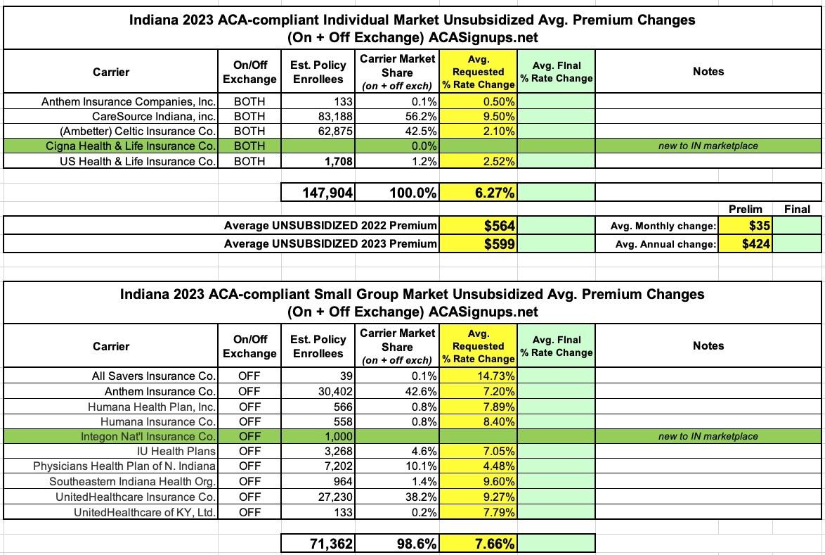 Indiana: (Preliminary) avg. unsubsidized 2023 #ACA rate changes: +6.3%