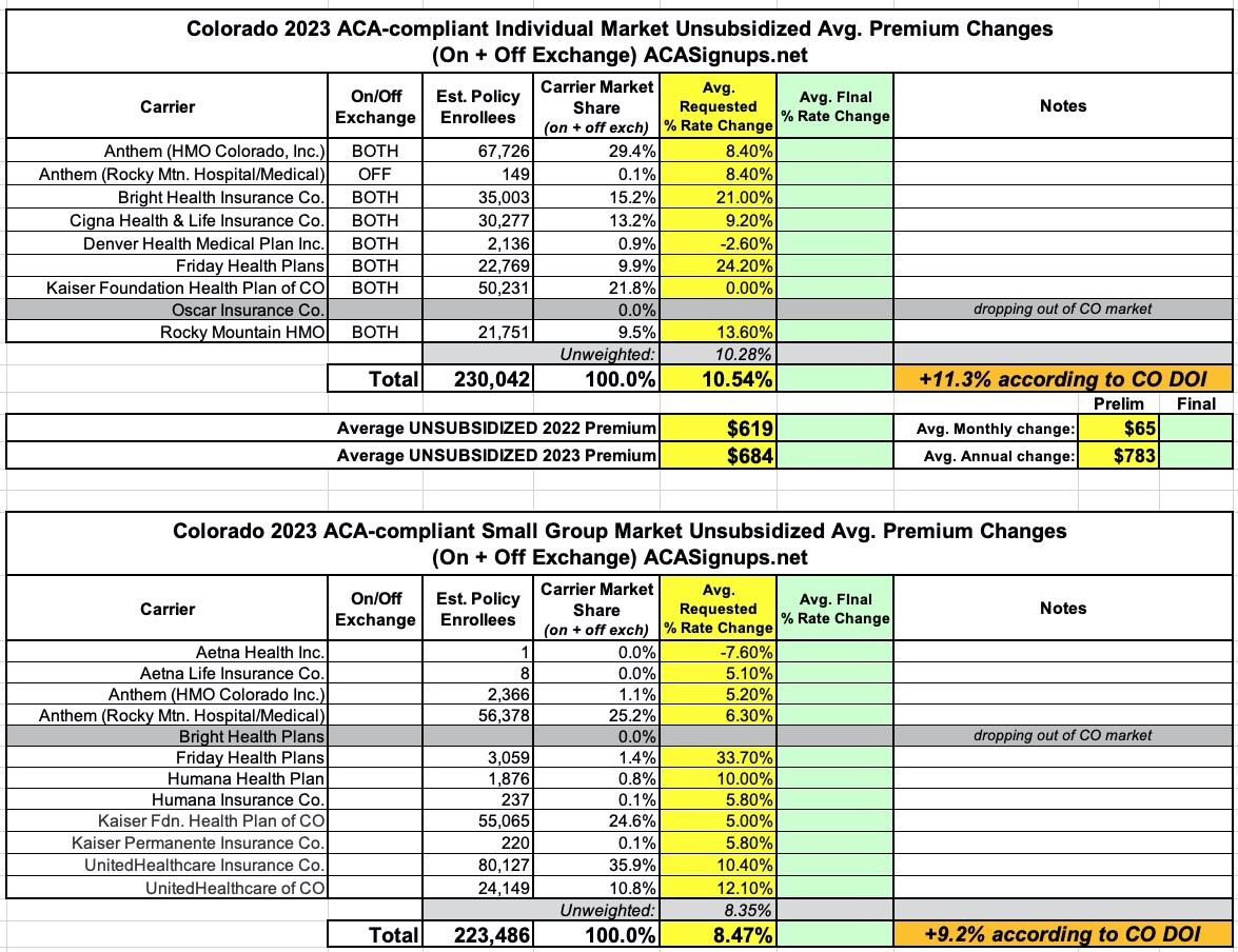 Colorado: (Preliminary) avg. unsubsidized 2023 #ACA rate changes: +11.3%; Colorado Option plans going live