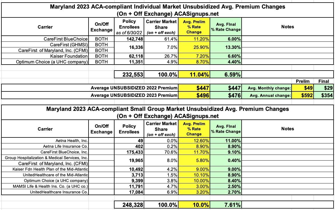 Maryland: Final Avg. Unsubsidized 2023 #ACA Rate Change: +6.6% (down from +11% requested)