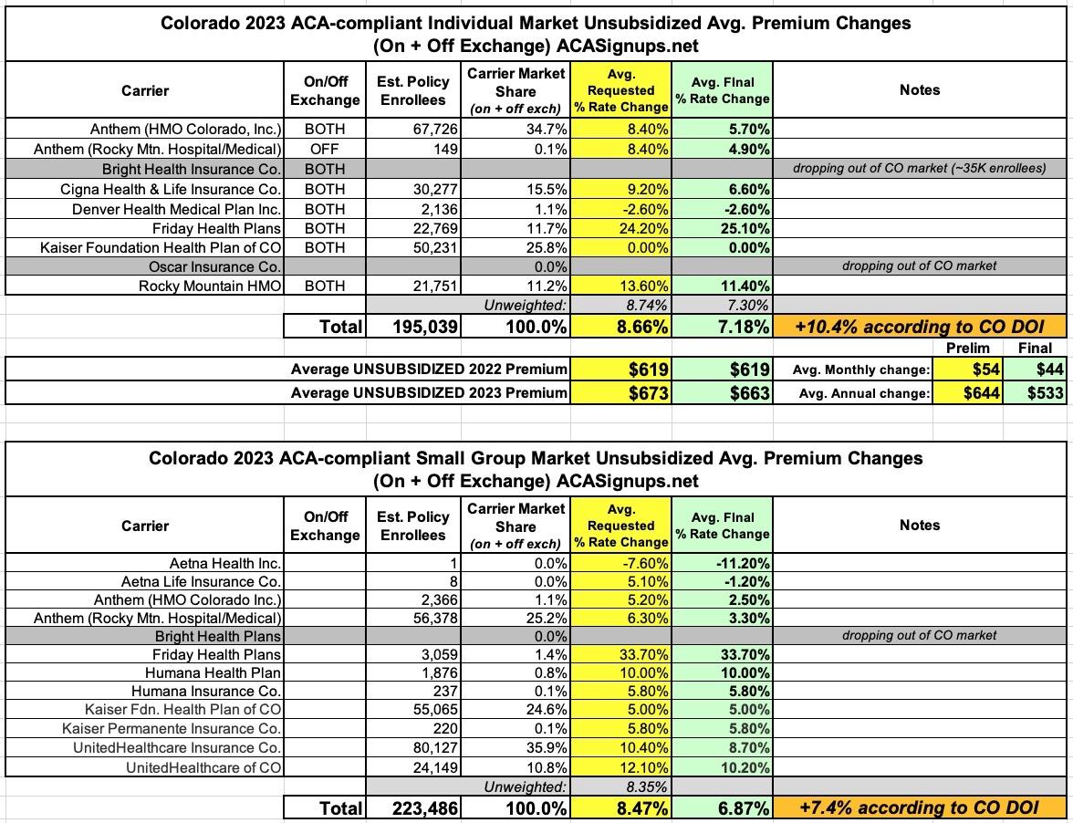 Colorado: Final avg. unsubsidized 2023 #ACA rate changes: +10.4%; Colorado Option plans going live