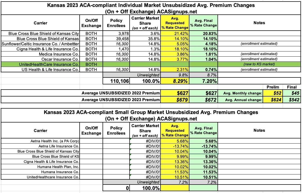 Kansas: Final semi-weighted avg. unsubsidized 2023 #ACA rate changes: +7.2%; UHC joining in