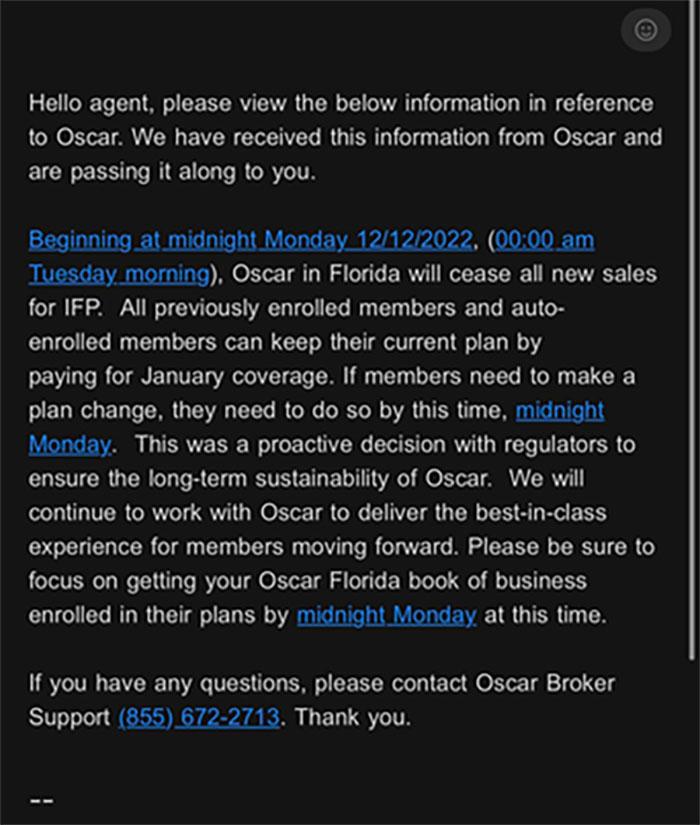 UPDATE: Good grief: This is another email directly from Oscar itself to Florida-based brokers which sell their policies: