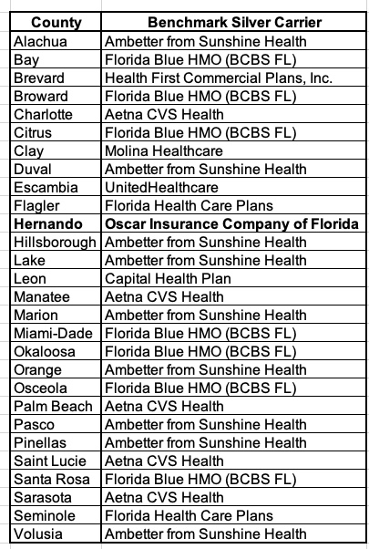 Sure enough, here's the Florida counties where Oscar offers plans in 2023 (along with the carrier offering the benchmark Silver plan for each...Oscar offers the benchmark plan in only one of them). Broward, Miami-Dade and Palm Beach are all among them: