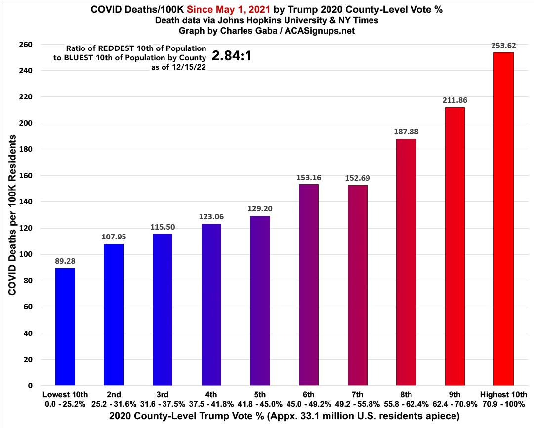 As always, what's even more disturbing is how closely the death rate by partisan lean matches the death rate by vaccination rate; they're almost mirror images of each other: Again, while the ratio has dropped since September, the death rate since May 1, 2021 in the reddest tenth of the country is, again, 2.8x higher than in the bluest tenth:
