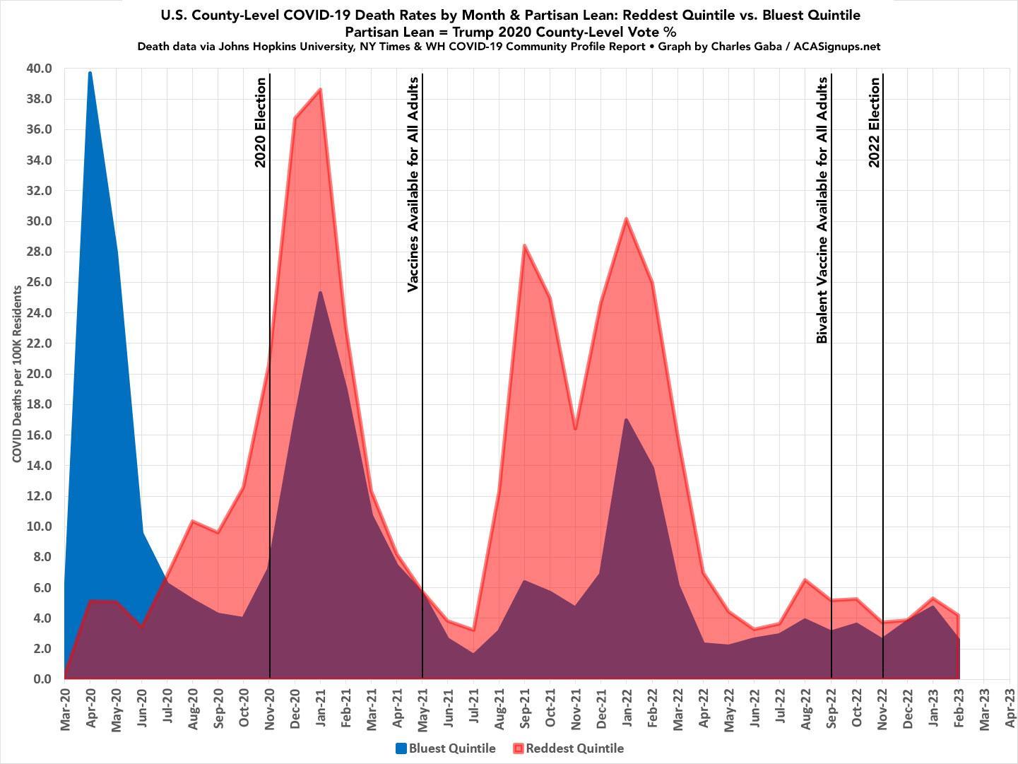 ...In this cohort study evaluating 538 ,159 deaths in individuals aged 25 years and older in Florida and Ohio between March 2020 and December 2021, excess mortality was significantly higher for Republican voters than Democratic voters after COVID-19 vaccines were available to all adults, but not before. These differences were concentrated in counties with lower vaccination rates, and primarily noted in voters residing in Ohio.
