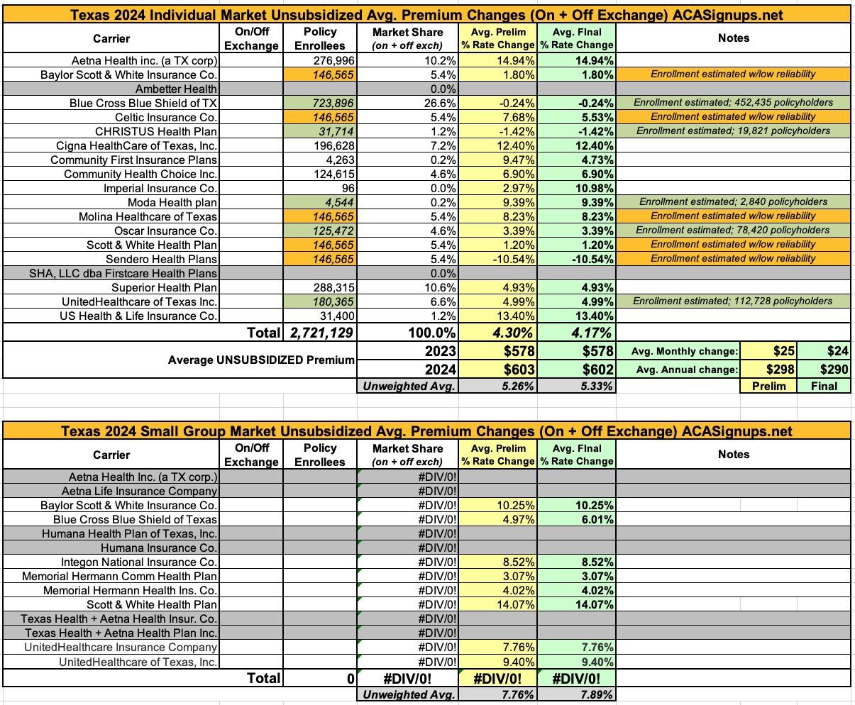 Texas: *Final* avg. unsubsidized 2024 #ACA rate changes: +4.2% (semi-weighted; updated)