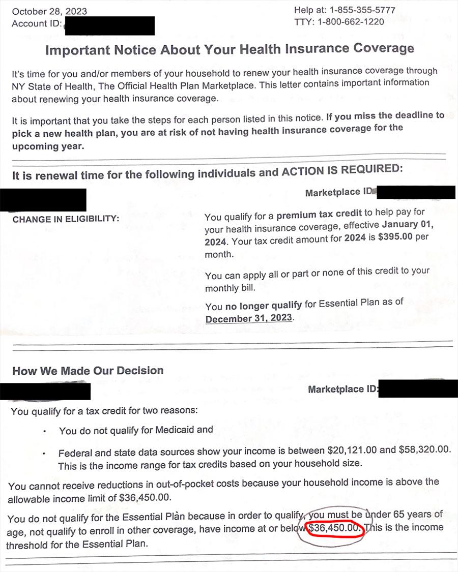Sure enough, they sent me the full letter they received from New York State of Health (personal info redacted, of course):