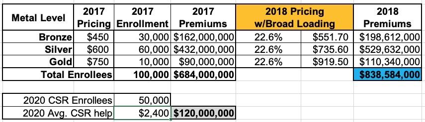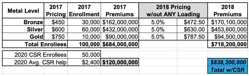 This carrier had 100,000 enrollees in 2017 and had to pay out $120 million in CSR assistance. They assumed that total enrollment and their CSR costs would be around the same (and the same ratios) in 2018 Since they knew they wouldn't get reimbursed from the federal government for their CSR costs in 2018, simply raising their premiums by 5% would mean a $120 million loss. Ouch: