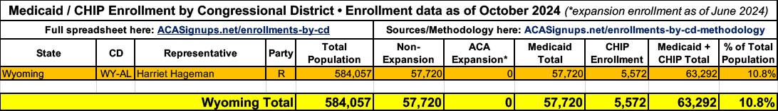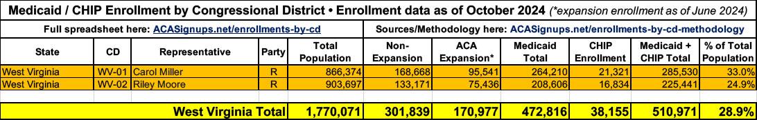 Since I already covered the sources & methodology there, and since the Trump Administration made a ham-handed attempt to cut off Medicaid payment portals yesterday, in this post I've converted the Master Spreadsheet into 52 suitable-for-sharing graphics which break out Medicaid & CHIP enrollment by both state/territory and Congressional District.