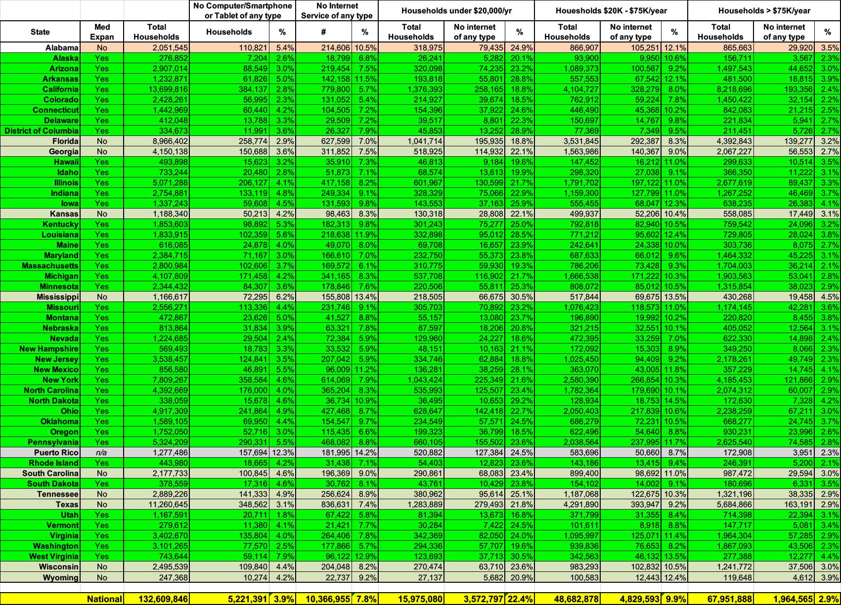 The expansion states with the highest percent of households without any type of internet service are, once again, West Virginia (12.9%), Louisiana (11.9%) and Arkansas (11.5%).