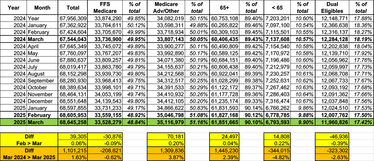 The Centers for Medicare & Medicaid Services just published updated enrollment data for Medicare, adding March 2025 to the data archive.