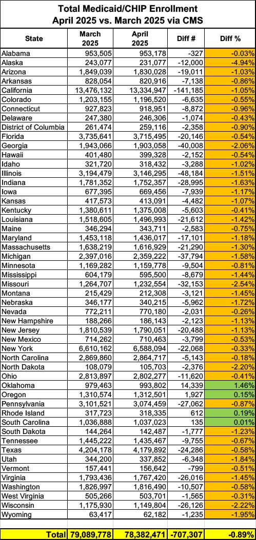 Total Medicaid/CHIP enrollment in April 2025 of ~78.4 million dropped about 0.9% from March 2025, or by just over 700,000 people.