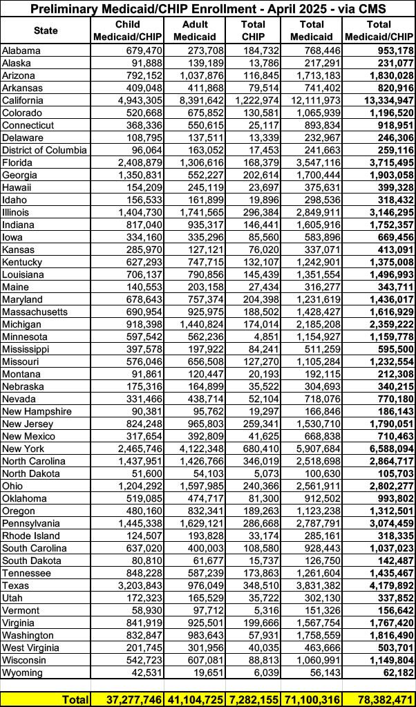 Trump Regime posts claimed April 2025 Medicaid/CHIP enrollment report: 78.4M, down ~700K from March
