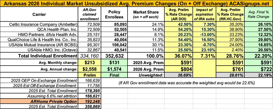 Then, a couple of weeks ago, Gov. Sanders issues her press release boasting about somehow causing the final 2026 filings to plummet to just 22% (using enrollment numbers which duplicate each other and which manage to "lose" 11,000 enrollees)...and finally, today, the state insurance dept seems to have belatedly "caught up with" the Governor by updating their website to mostly match the weighted average rate hike her press release claimed...while simultaneously changing their enrollment count to be ~27,000 fewer than the press release table added up to and ~1,500 fewer than the precise number Sanders claims in the press release text.