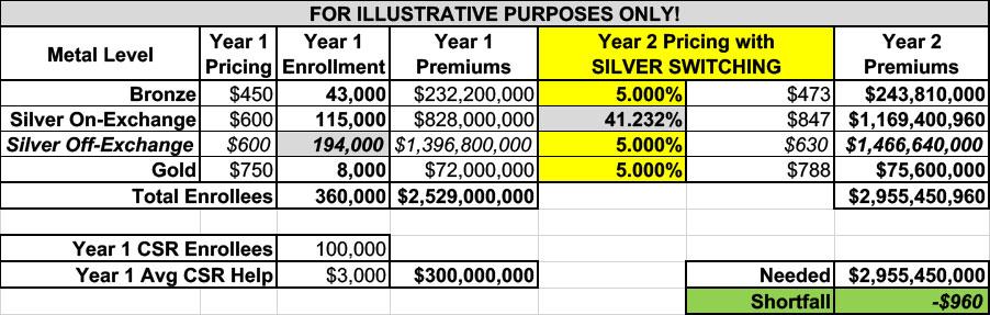 If I go the extra mile and do full Silver Switching, we're right back at where we were before: A 41.2% average premium hike for on-exchange Silver plans only, because the same load is being spread across the same 115,000 enrollees: