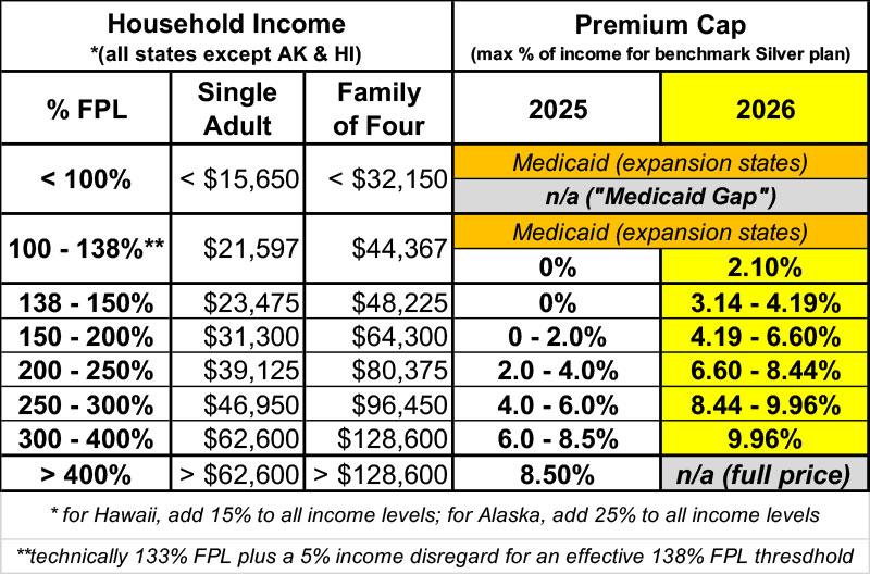 NOTE: Before I begin, it's important to know what the Federal Poverty Level (FPL) will be in 2026. The FPL is a critical part of the formula used to determine eligibility for both premium tax credits as well as Cost Sharing Reduction (CSR) subsidies and Medicaid expansion eligibility in the states which have expanded the program. In addition, the FPL threshold goes up by a few percent each year due to inflation.