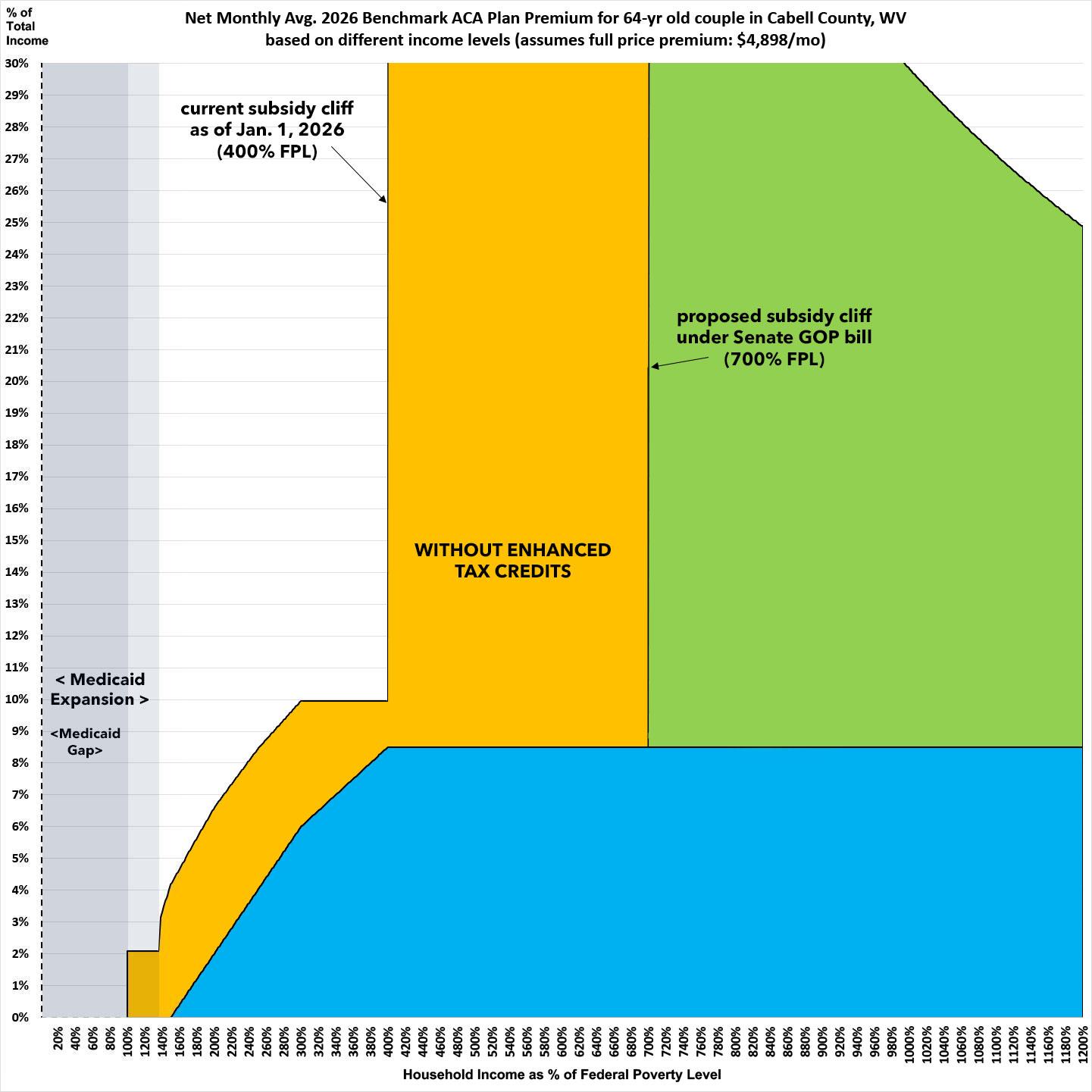 That's right: A 64-yr old couple living in Cabell County, West Virginia would still have to pay a jaw-dropping 43% of their gross income in premiums alone if they earn even $1 over 700% FPL, which is $148,050 for two people.